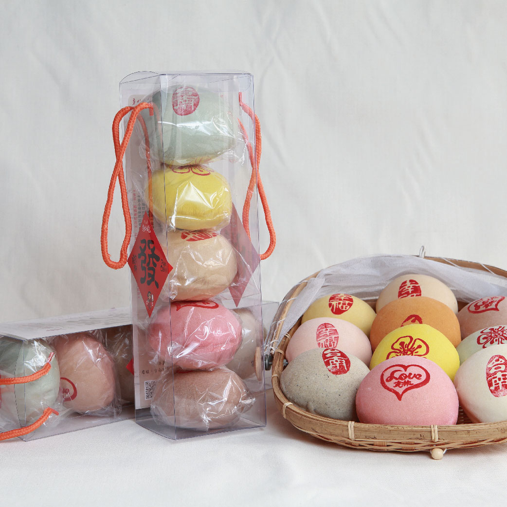 新意的膨餅伴手禮。使用冷壓麻油、紅椒粉、梔子花、鬱金粉和可可等天然食材,為膨餅抹上繽紛的色彩,象徵台南寓意的鳳凰花、台南和幸福圖騰,出自古都書法家之手,在傳統和文創之間,找到最美的結合。